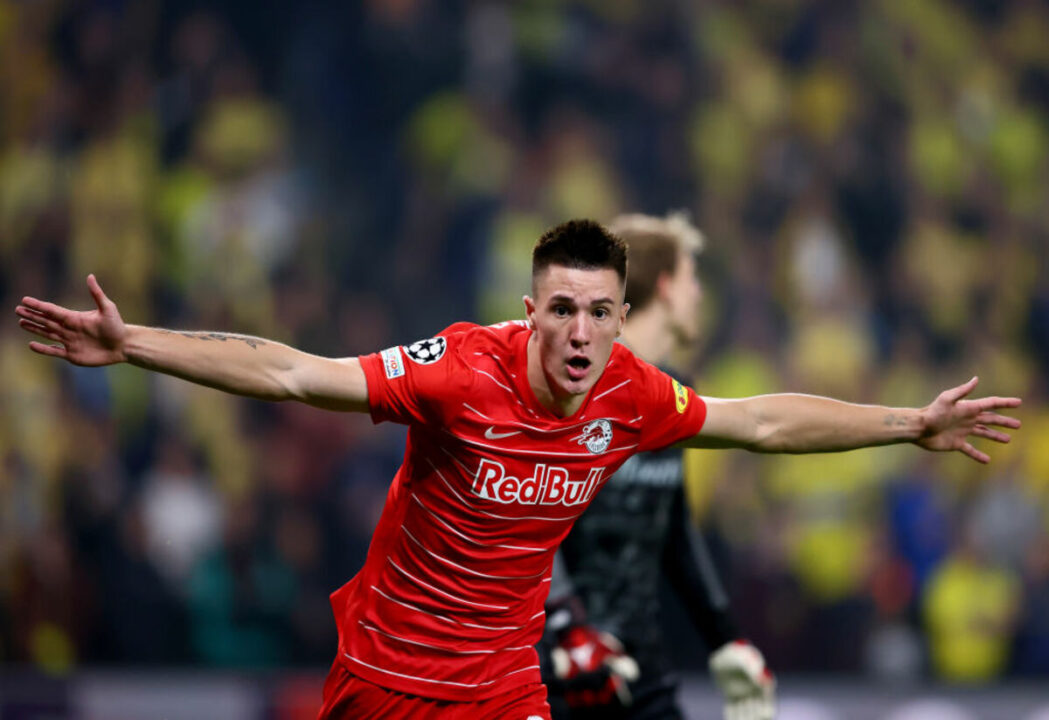 COPENHAGEN, DENMARK - AUGUST 25: Benjamin Sesko of FC Red Bull Salzburg celebrates after he scores his team's opening goal during the UEFA Champions League Play-Offs Leg Two match between Brondby IF and FC Red Bull Salzburg at on August 25, 2021 in Copenhagen, Denmark. (Photo by Martin Rose/Getty Images)