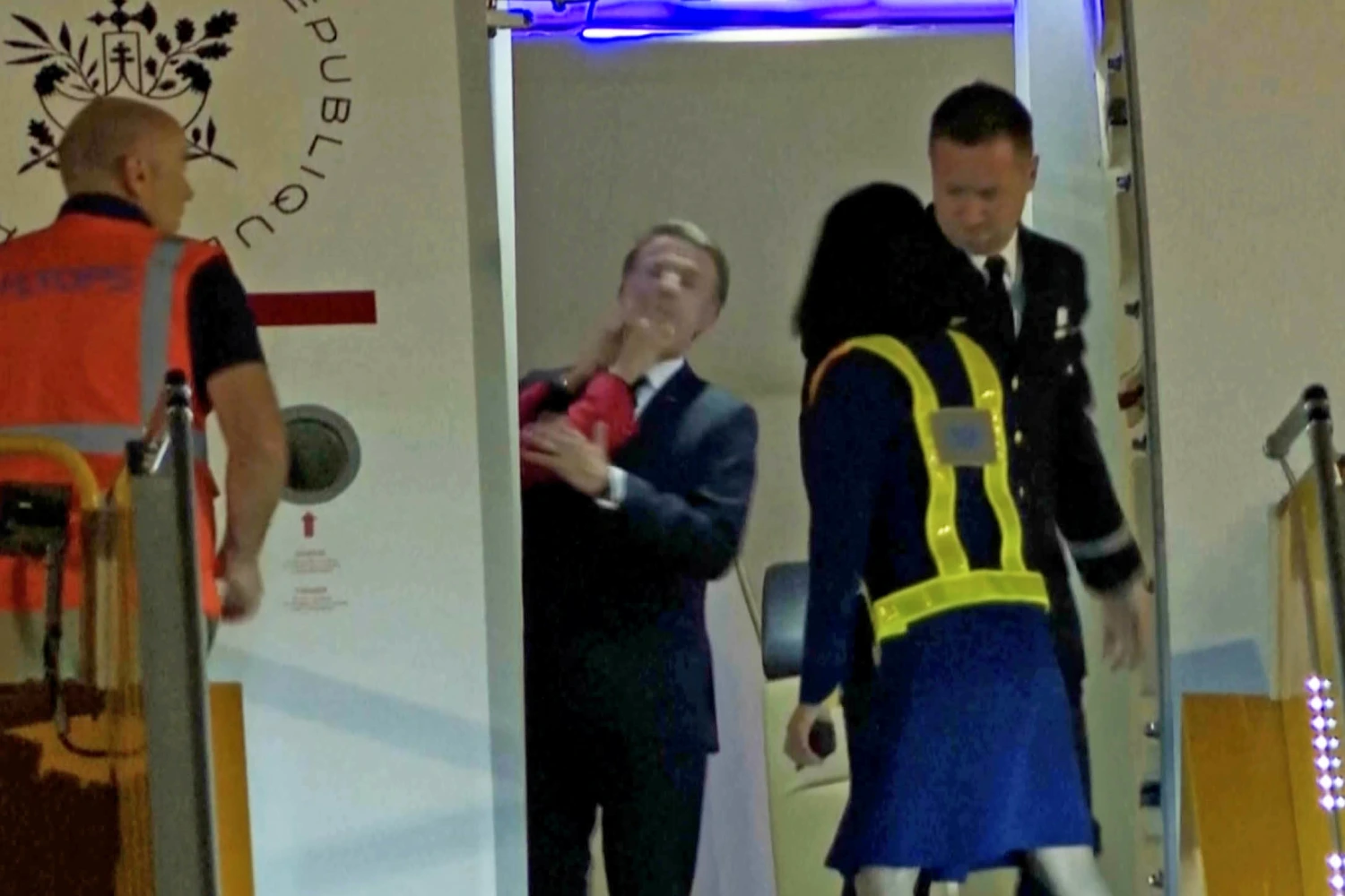 French president Emmanuel Macron addresses his wife shoving him in the face on aircraft