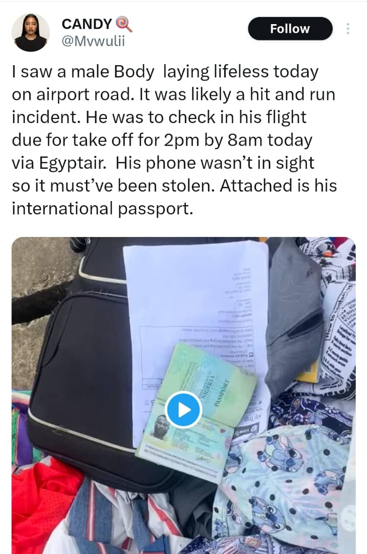According to an eyewitness, the deceased was meant to check in for an EgyptAir flight scheduled for 2 p.m., but was reportedly seen dead around 8 a.m. — just hours before his supposed departure.